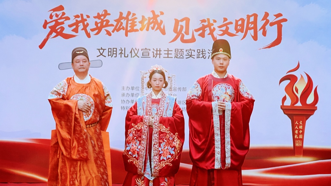 活动中,文明礼仪的传承被赋予多元表达——地方喜剧演员带来的方言相声《夸南昌》,以“一梗接一梗”的幽默,将滕王阁的历史底蕴、拌粉瓦罐汤的烟火滋味,让观众在笑声中感受到“英雄城”的独特魅力;微剧场《中华礼仪传家风》则通过一场传统婚礼场景,将孝亲之礼、信诺之约娓娓道来,演员们身着传统服饰的每一个躬身、每一句唱词,都让“孝亲敬长、言信行果”的家风训导变得可触可感。现场一位阿姨说:“原来老祖宗的规矩不是束缚,是让日子越过越暖的智慧。”