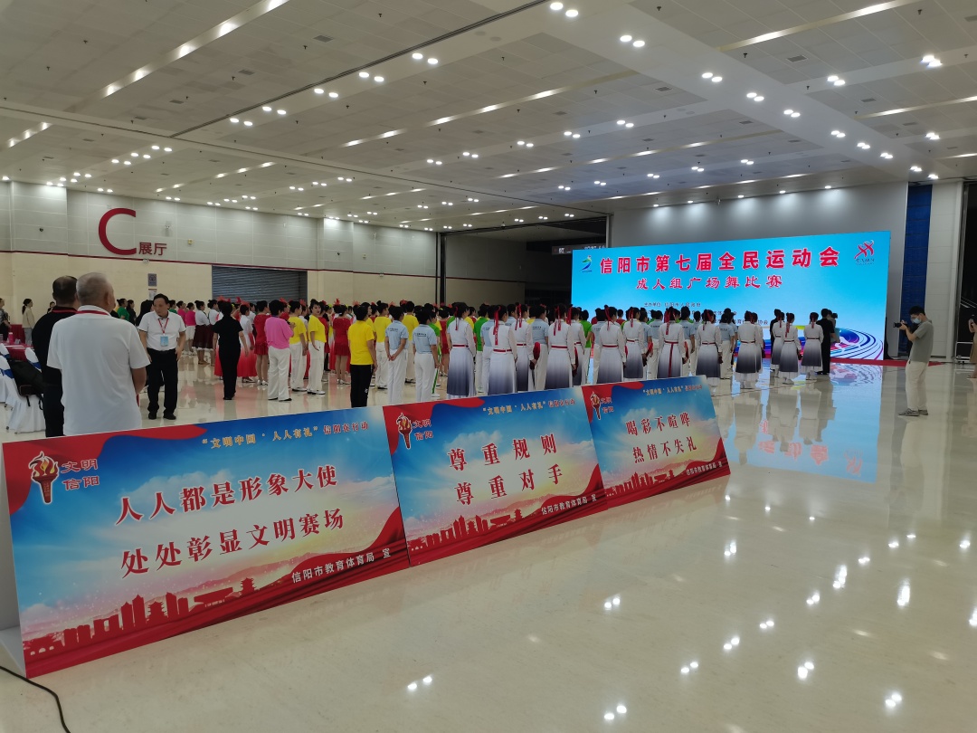 信阳市第七届全民运动会成人组广场舞比赛现场。